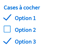 Ce type de champ fournit des cases qui peuvent être cochées - et donc, validées - avec un clic. Il est possible de cocher autant de choix voulus ou aucun de ces choix. En terme de fonctionnement, les possibilités sont les mêmes qu'avec une liste déroulante à choix multiples. La présentation, en revanche, est différente :
