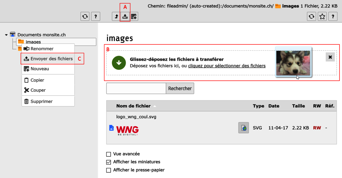 Avant d’utiliser un fichier média dans une page web, il est conseillé de l’ajouter dans le système de fichiers de votre site. Voici les différentes méthodes vous permettant de charger un fichier depuis votre ordinateur vers un répertoire de votre site :